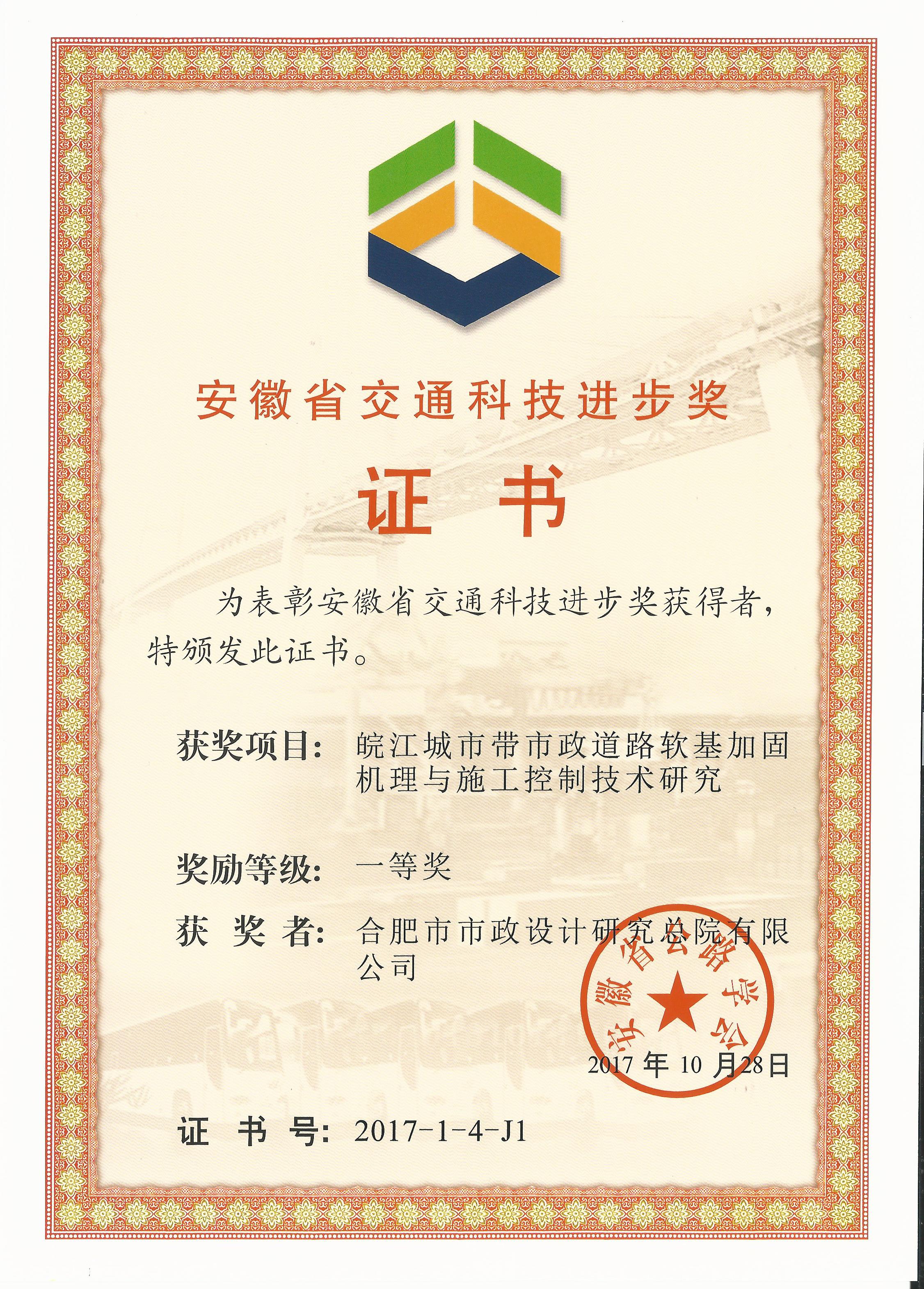 皖江城市带市政道路软基加固机理与施工控制技术研究——省级交通科技进步一等奖
