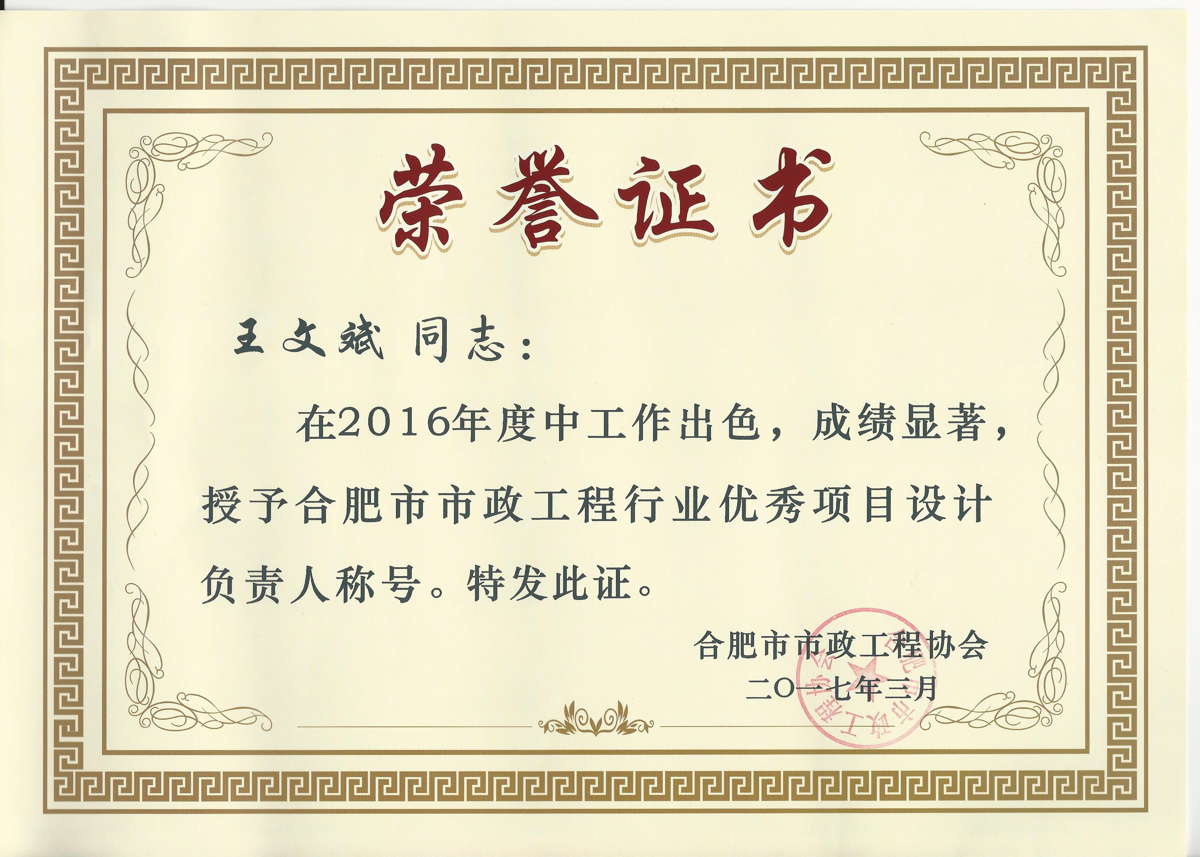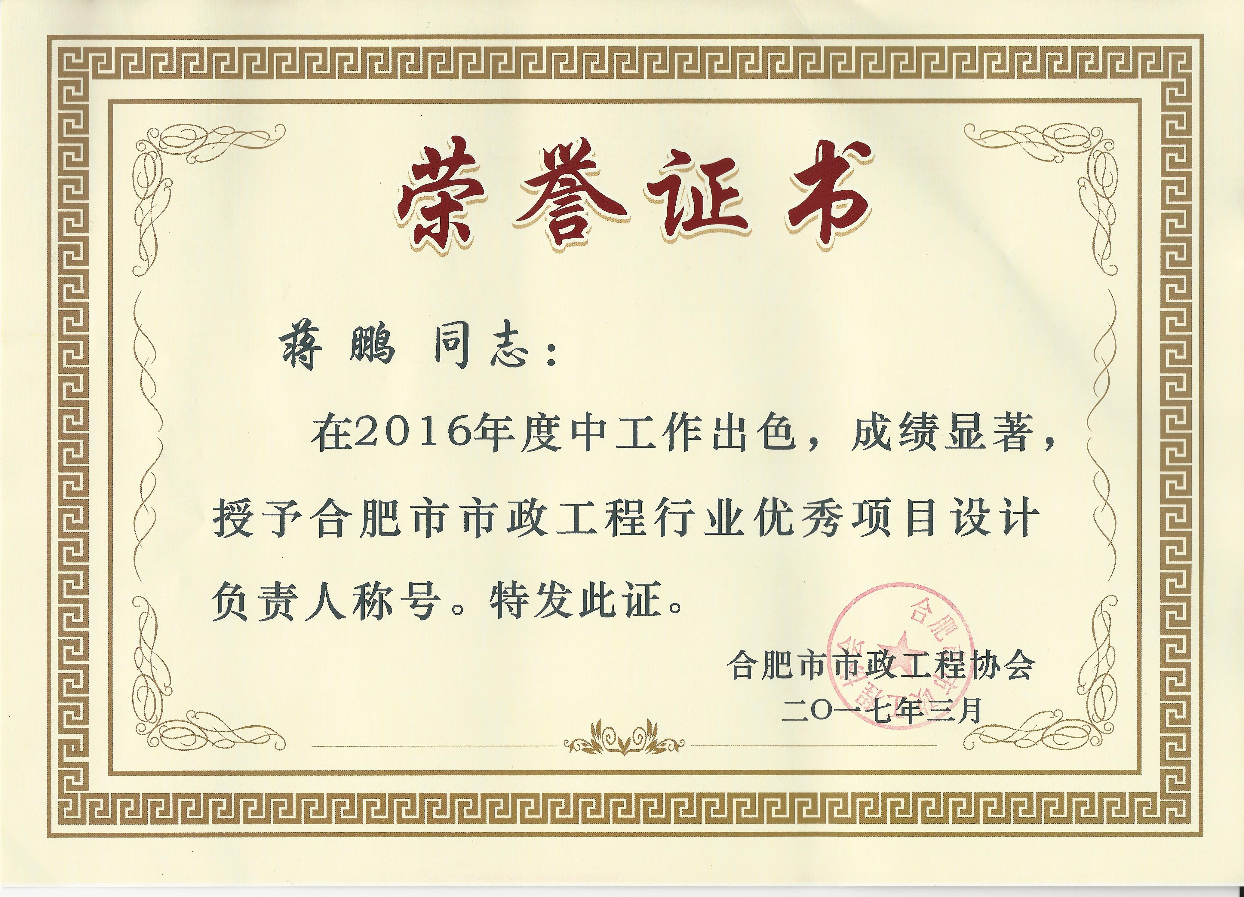 我院荣获2016年度合肥市市政工程行业优秀企业光荣称号,蒋鹏、王文斌两位同志荣获2016年度合肥市市政工程行业优秀项目设计负责人称号。
