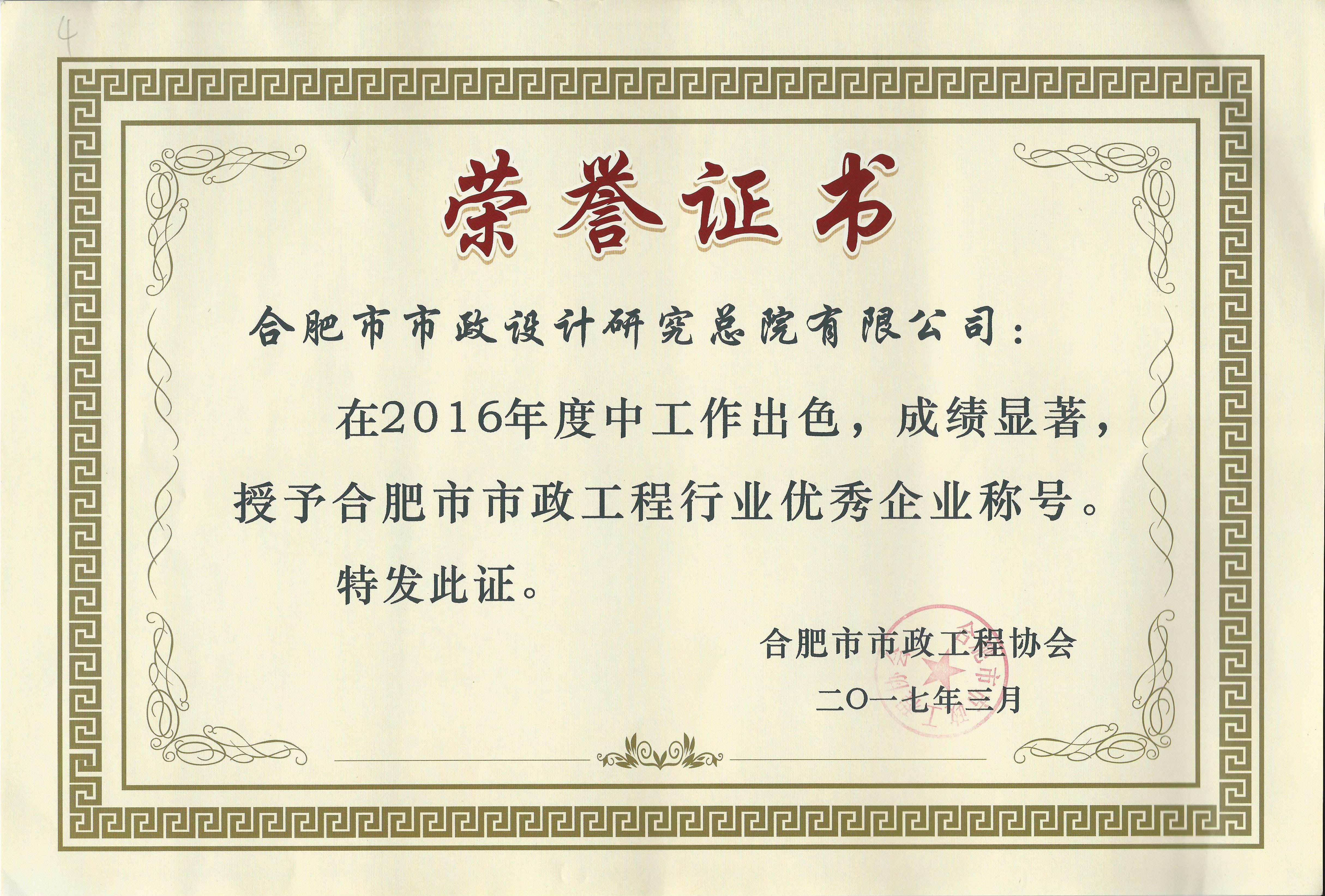 我院荣获2016年度合肥市市政工程行业优秀企业等荣誉称号