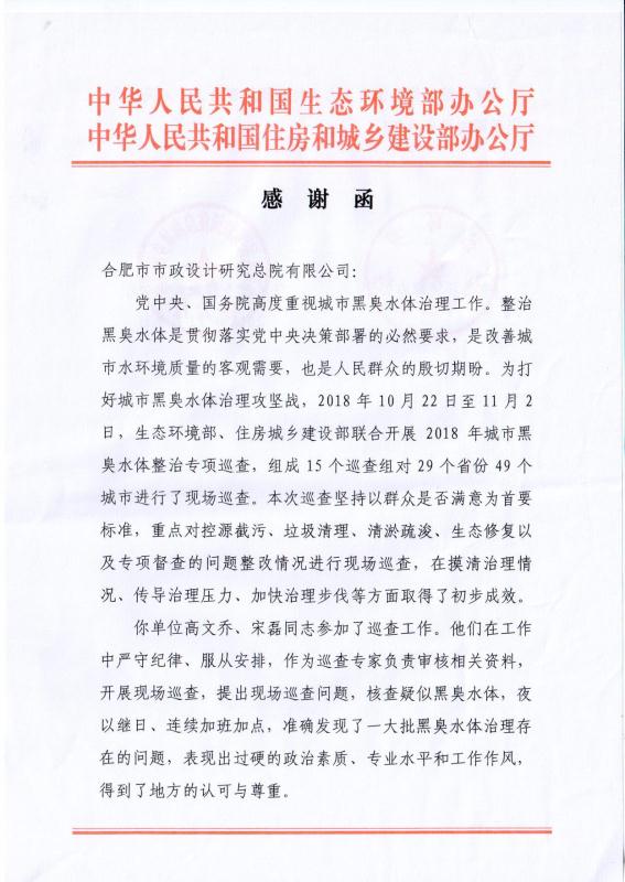 “衷心感谢你单位的大力支持和积极配合,并对高文乔、宋磊同志提出表扬!”国家生态环境部办公厅、住房和城乡建设部办公厅联合发来的感谢函中如此写道,高度赞扬了合肥市市政设计研究总院有现公司在2018年城市黑臭水体整治专项巡查行动中所作出的贡献。