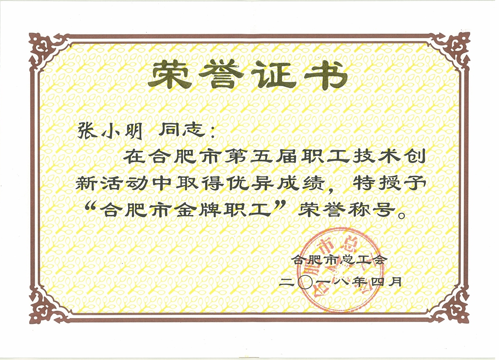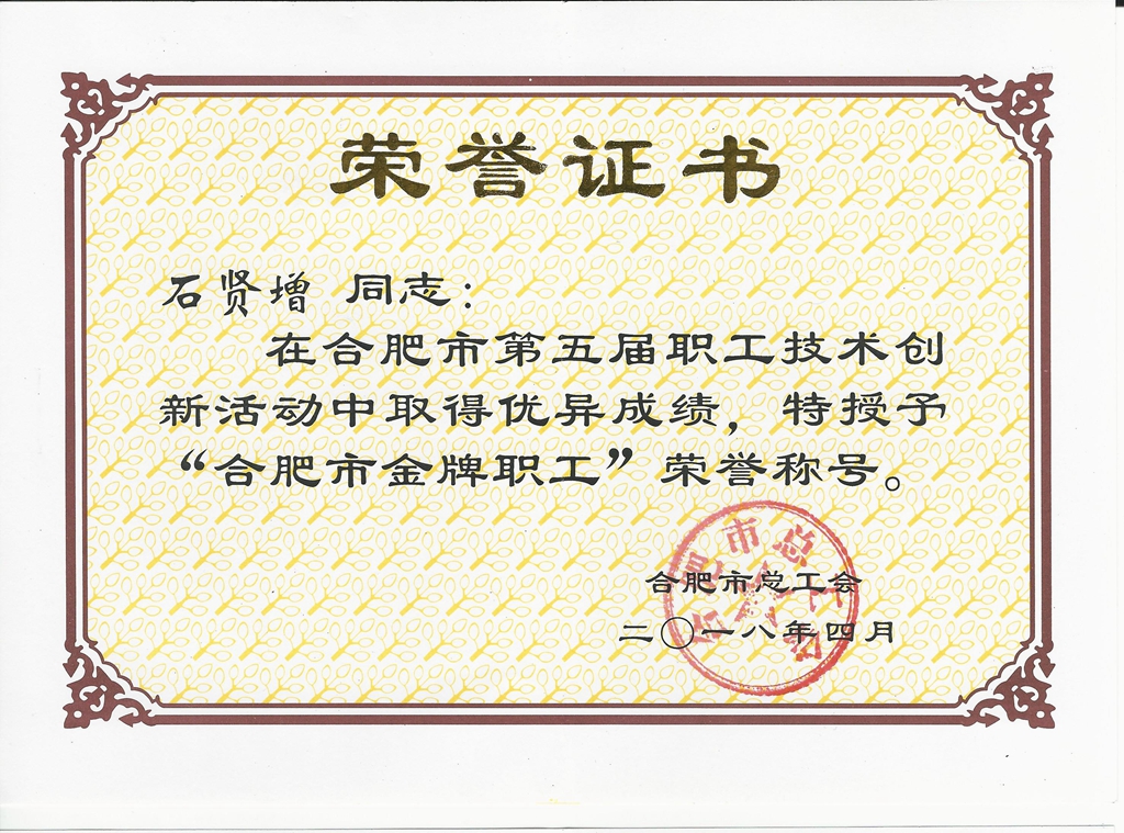日前,在合肥市第五届职工技术创新活动中,我院石贤增、莫安生、张小明三位同志因为在活动中取得优异成绩,被合肥市总工会授予“合肥市金牌职工”荣誉称号。