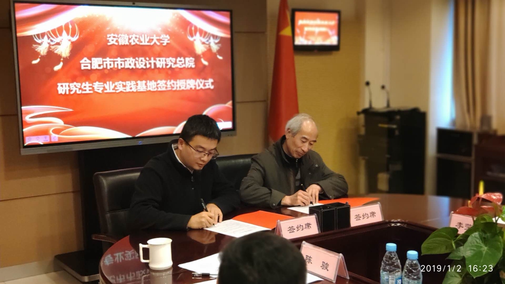 2019年1月2日,我院和安徽农业大学在院第一会议室举行研究生实践基地签约及揭牌仪式。安徽农业大学林学与园林学院党委书记唐红萍、副院长徐小牛、风景园林系主任陈永生及我院领导班子成员、院总工、园林景观院部门负责人等领导出席签约仪式及交流会。