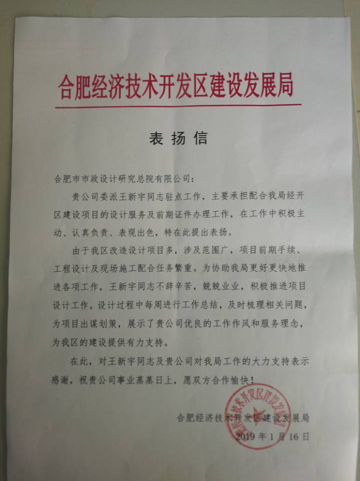 为便于建设单位和我院间协调事宜,道桥二院特派王新宇同志借调在经开区建发局承担驻点工作,主要承担配合建发局经开区建设项目的设计服务及前期证件办理工作。由于经开区改造设计项目多,涉及范围广,项目前期手续、工程设计及现场施工配合任务繁重,为此,王新宇同志不辞辛苦,兢兢业业,积极推进项目设计工作,获得了建设单位的认可,并获赠表扬信一封。