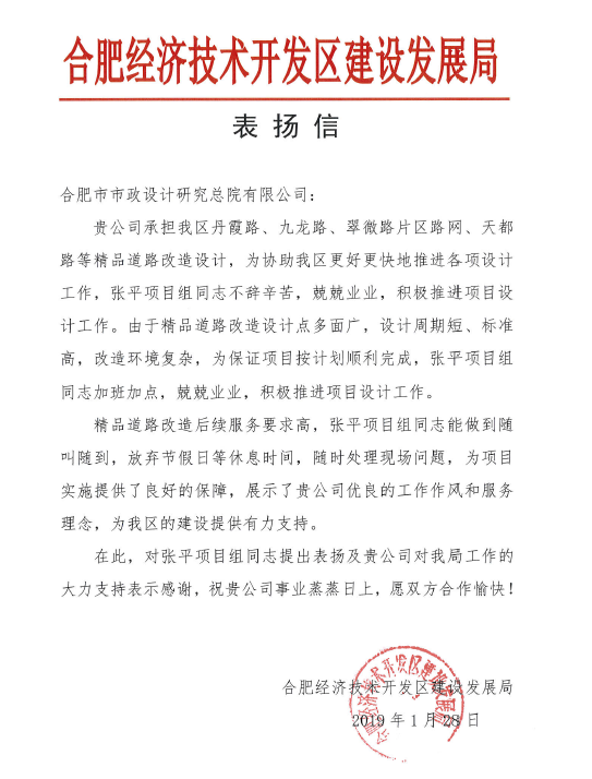 弘扬工匠精神,致力精品工程设计——道桥二院获得合肥经济技术开发区建设发展局两封感谢信