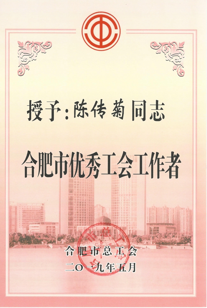 在合肥市劳动竞赛委员会、合肥市总工会开展的劳动竞赛评选活动中,我院工会主席陈传菊同志由于成绩突出,被授予“合肥市优秀工会工作者”荣誉称号,受到了市劳动竞赛委员会、市总工会的表彰。