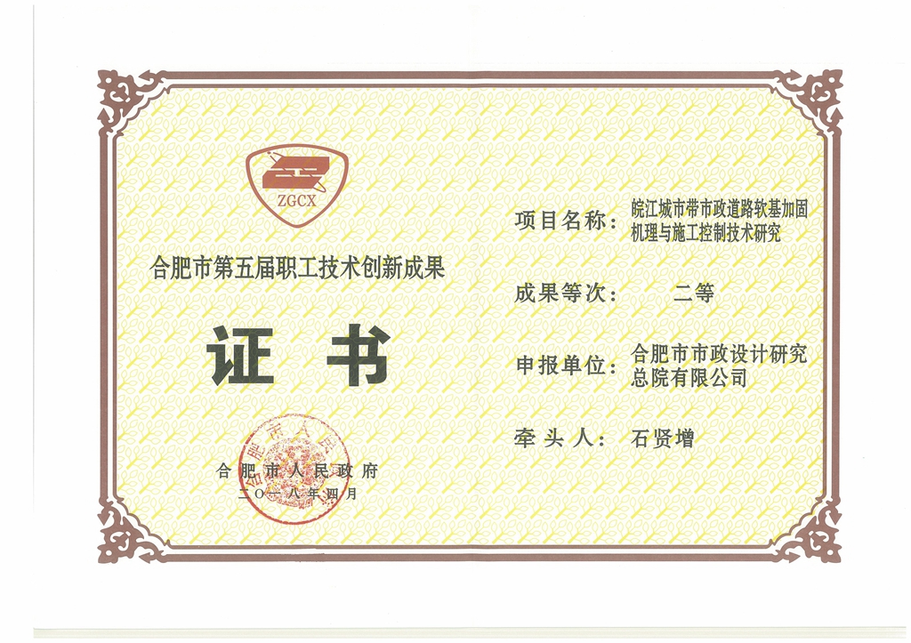 合肥市第5届职工技术创新成果二等奖-皖江城市带市政道路软基加固机理与施工控制技术研究