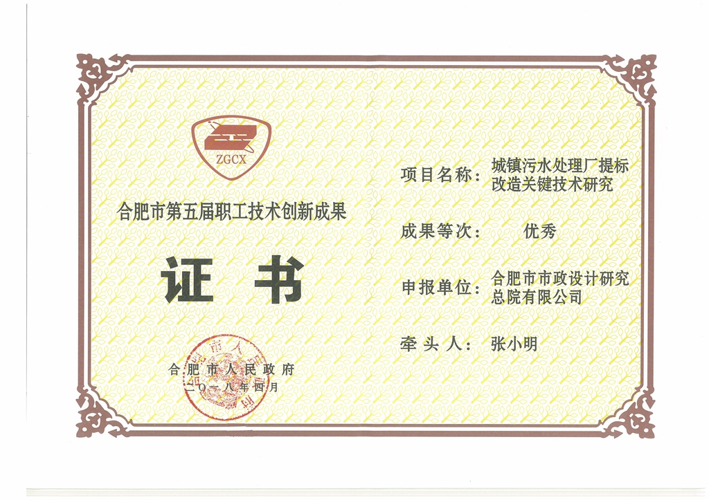 合肥市第5届职工技术创新成果优秀奖-城镇污水处理厂提标改造关键技术研究