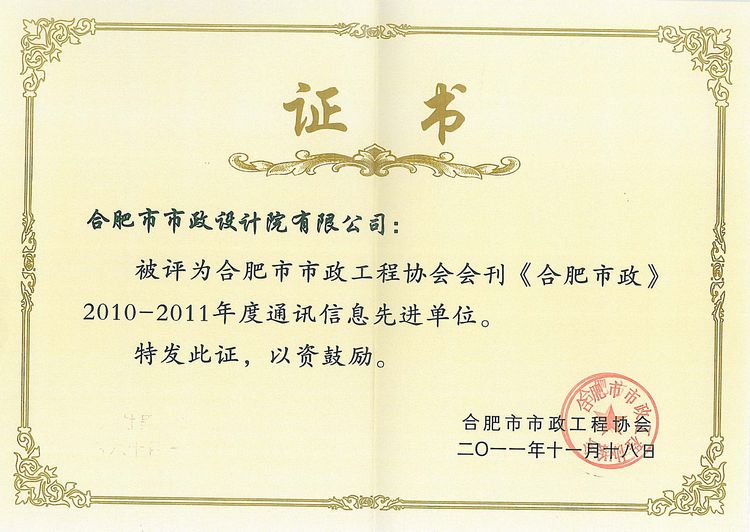 2011年8月18日—19日,合肥市市政工程协会《合肥市政》编委会暨通讯信息员、联络员会议在黄山召开,我院分管领导和通讯信息员参会。会上合肥市市政工程协会评选出5个通讯先进单位、4位先进个人及优秀论文、图片,我院荣获2010-2011年度“通讯信息先进单位”称号。