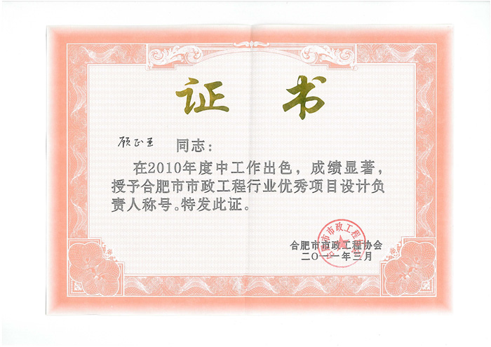 年度合肥市市政工程行业优秀设计项目负责人称号。