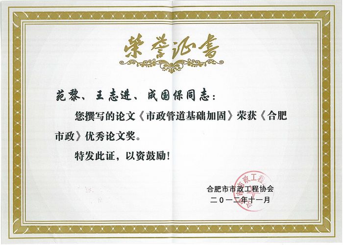 会上合肥市市政工程协会评选出通讯先进单位、先进个人及优秀论文、图片等,我院苑藜、王志进、成国保的《市政管道基础加固》获得优秀论文奖。