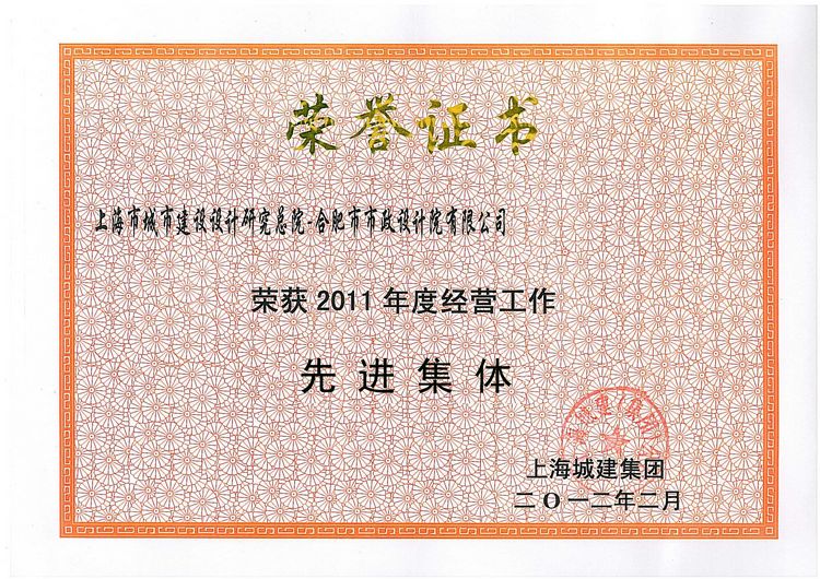 2月5日,上海城建集团召开2011年度经营工作总结会暨表彰大会。会上我院荣获上海城建集团“2011年度经营工作先进集体”称号。