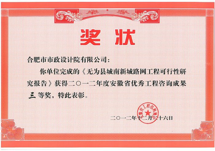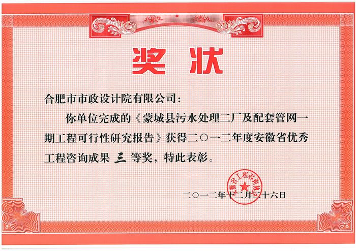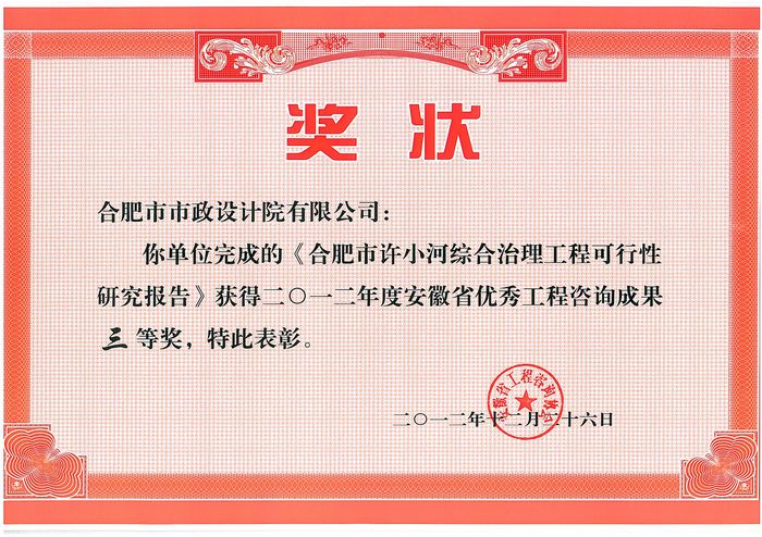 个项目获2012年度安徽省优秀工程咨询成果三等奖。