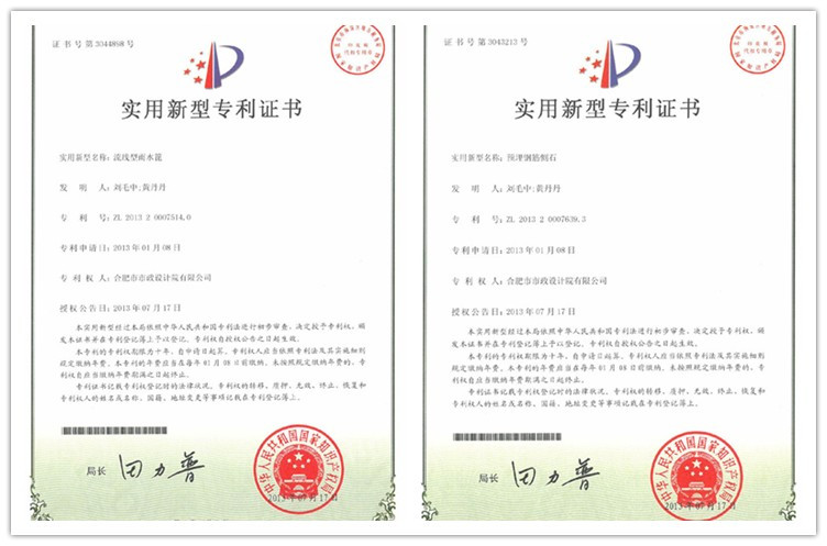 热烈祝贺我院职工刘毛中、黄丹丹两同志近日共同获得国家知识产权局颁发的流线型雨水篦和预埋钢筋侧石两项实用新型专利证书,这也是我院职工首次获得国家专利授权。