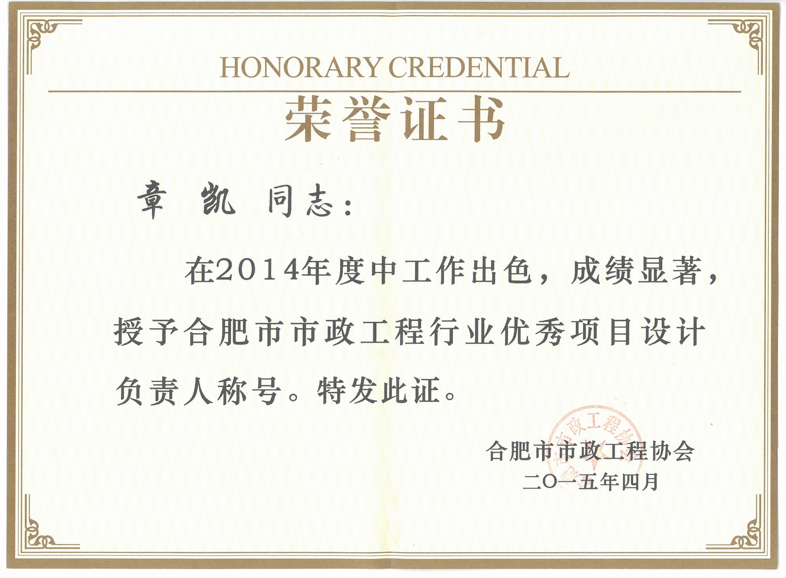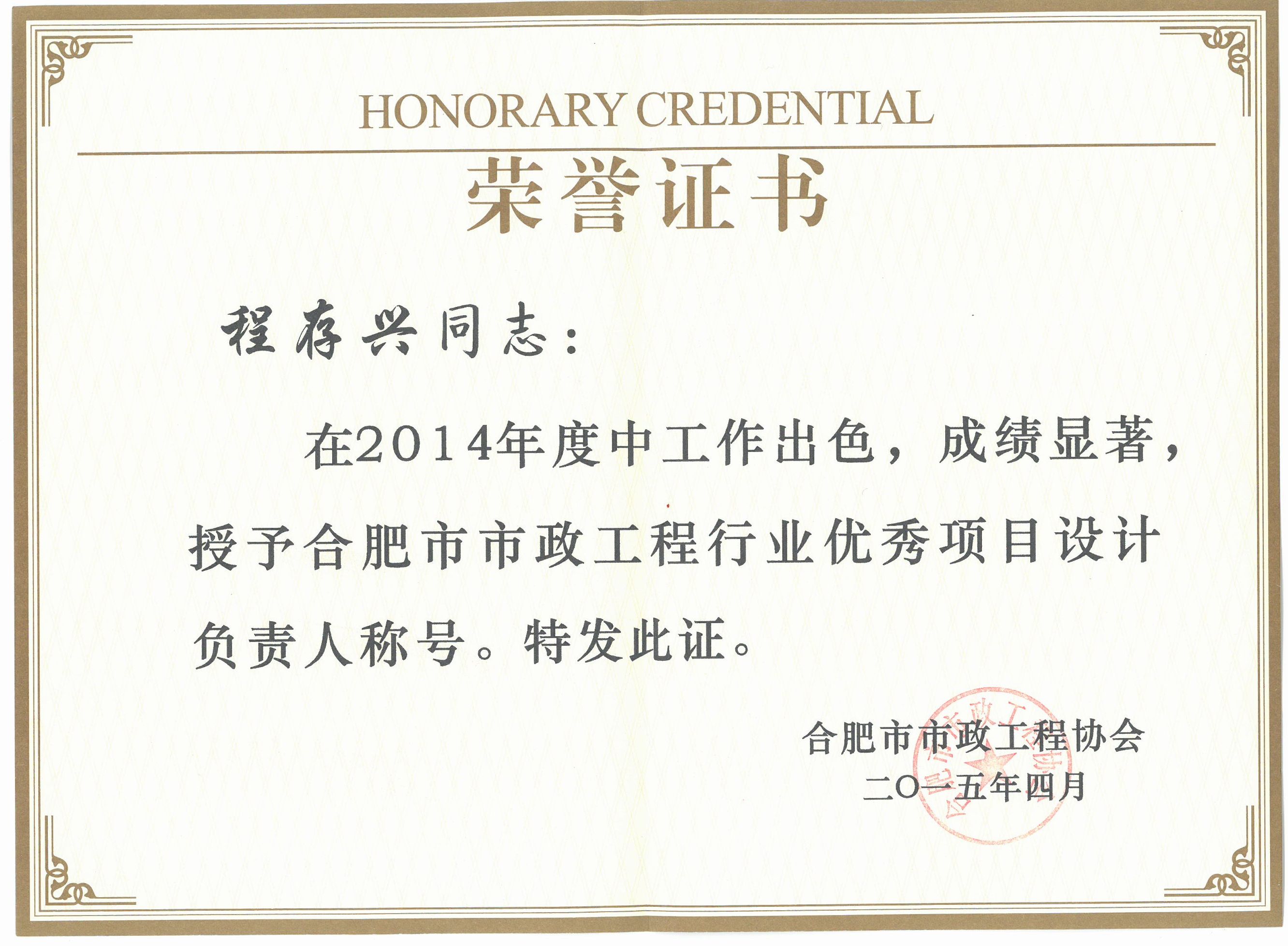 我院荣获2014年度合肥市市政工程行业优秀企业光荣称号,章凯、夏绍凤、程存兴三位同志荣获2014年度合肥市市政工程行业优秀项目设计负责人称号。