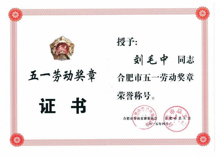 近日,在合肥市劳动竞赛委员会、合肥市总工会开展的劳动竞赛评选活动中,我院刘毛中同志由于成绩突出,被授予“五一劳动奖章”荣誉称号,受到了市劳动竞赛委员会、市总工会的表彰奖励。