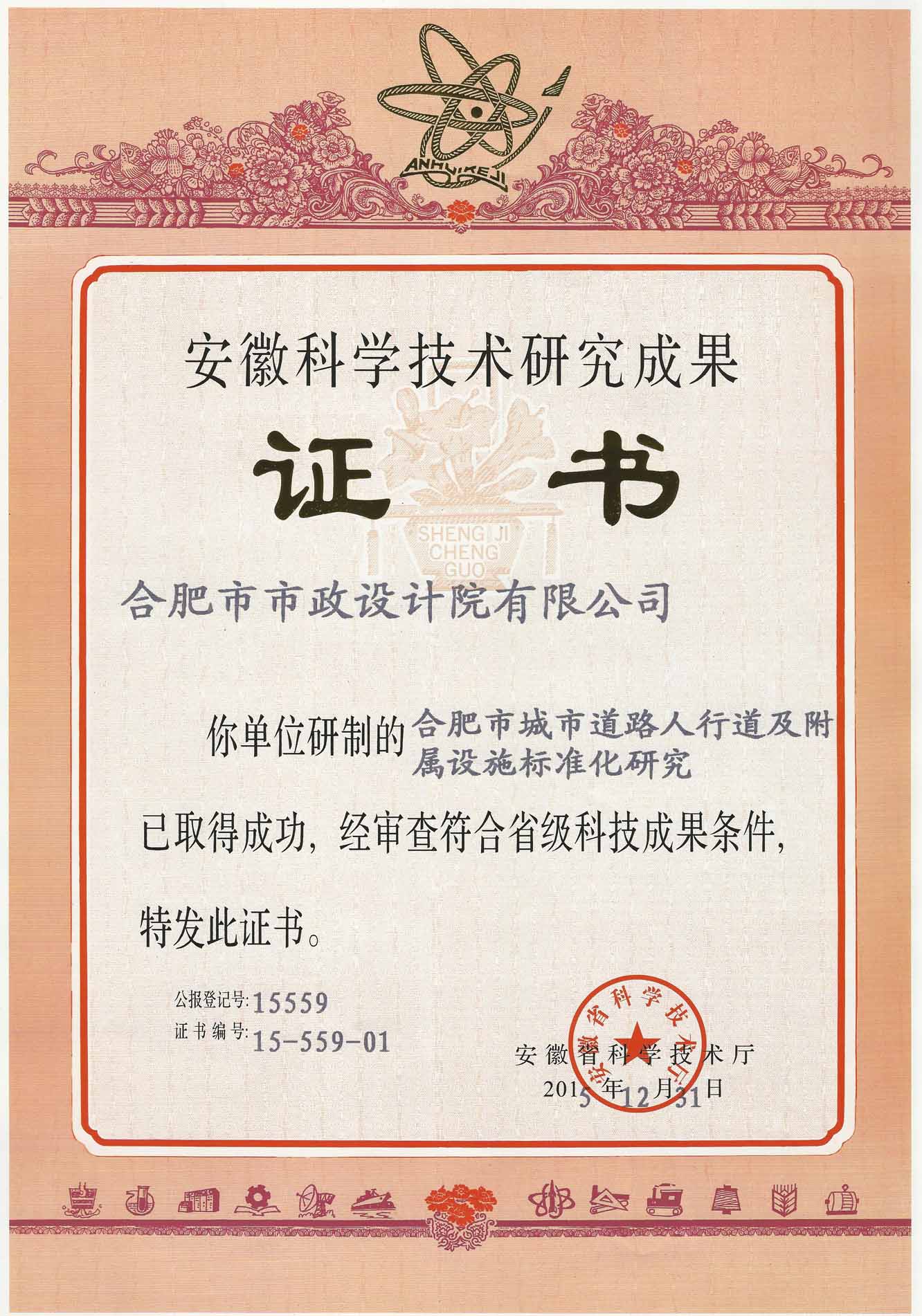 热烈祝贺我院研制的“合肥市城市道路人行道及附属设施标准化研究”荣获安徽科学技术研究成果证书称号