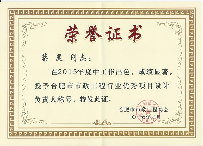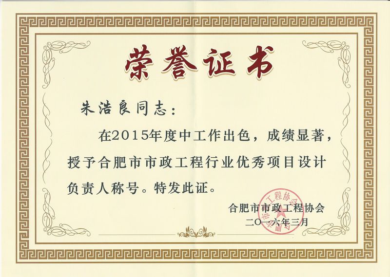我院由于在过去的2015年度中表现出色,成绩显著,被合肥市市政工程协会授予"合肥市市政工程行业优秀企业”称号;王炉光、蔡昊、朱浩良三位同志被授予“合肥市市政工程行业优秀项目设计负责人”称号。