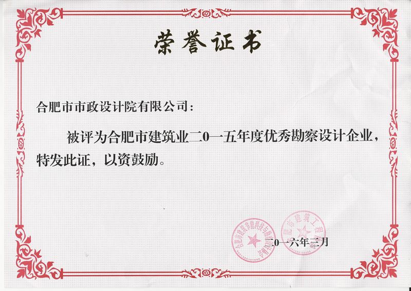 我院荣获合肥市建筑业2015年度优秀勘察设计企业荣誉称号