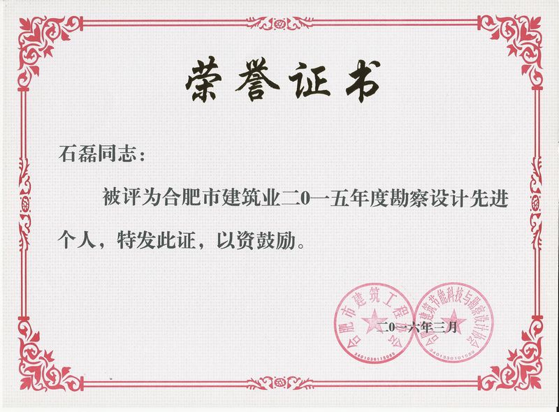 年度优秀勘察设计企业荣誉称号,石磊同志荣获合肥市建筑业